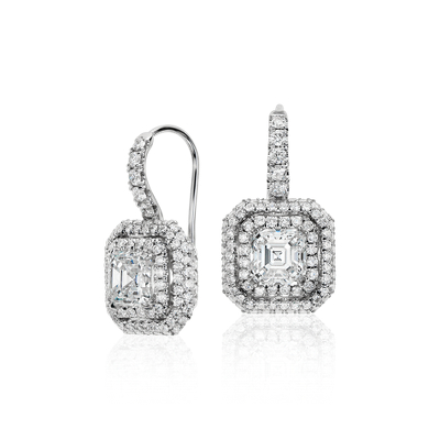 Extraordinary scintillation, these diamond drop earrings showcase Asscher-cut diamonds complemented by a double halo of brilliant pavé-set round diamonds in each 18k white gold French wire frame earring.