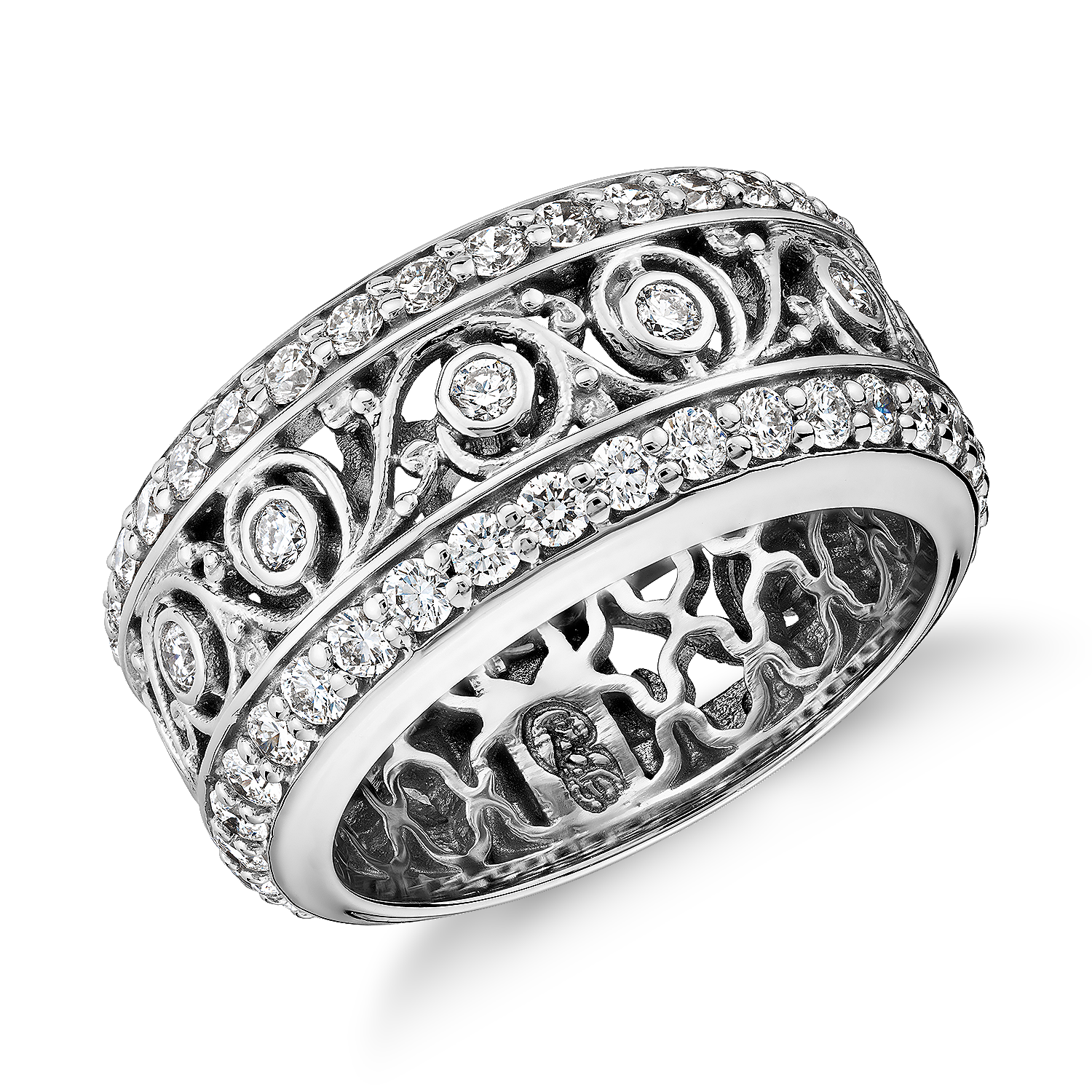 Exquisite decorative detailing makes this significant 18k white gold eternity band a true standout. Two rows of pavé-set diamonds frame even more tiny diamonds set in a distinctive swirling leaf design.