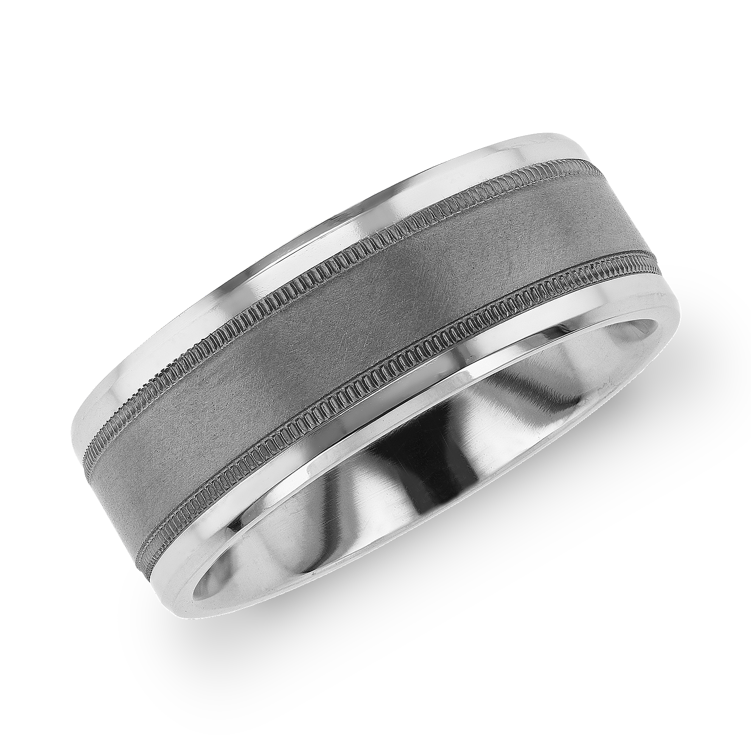 Beveled edges and milgrain inlay give this tantalum and 14k white gold wedding band enduring strength and subtle, textural touches.