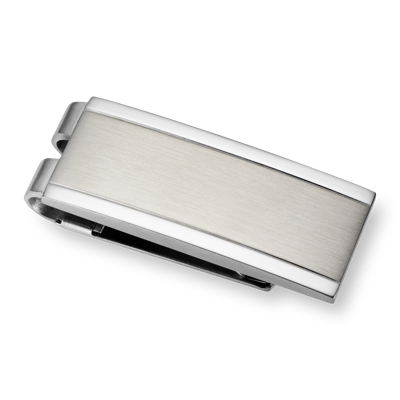 A dapper accessory, this money clip is crafted in brushed stainless steel framed by polished edges.