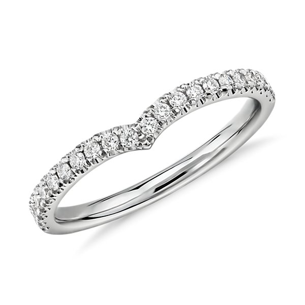A row of brilliant diamonds glitters along this comfort-fit 14k white gold wedding ring. The peaked V is meant to curve around your engagement ring for a complementary fit.