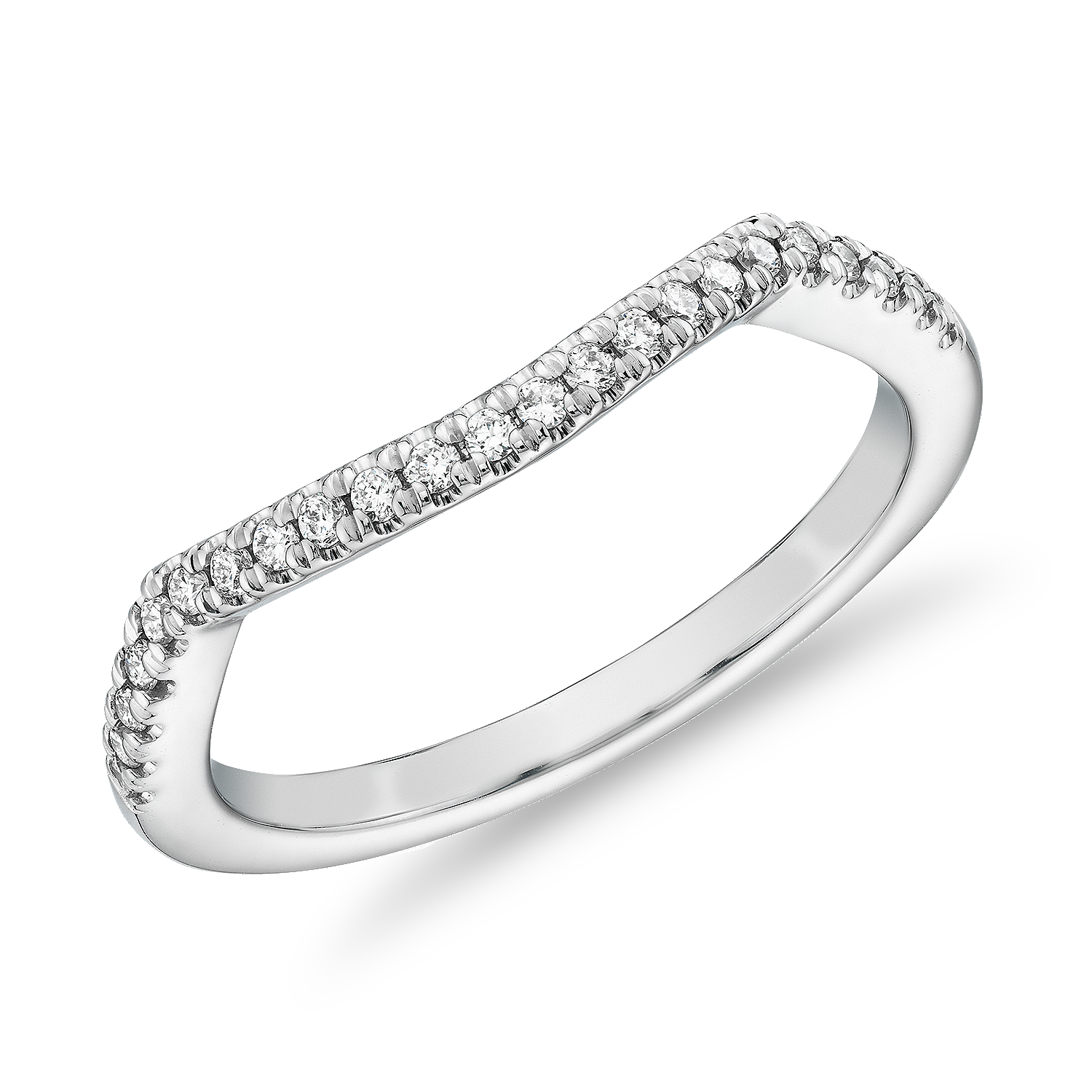 You’ll want to show off your wedding ring just as much as your engagement ring with this classic band of 14k white gold gently curved to accommodate and enriched with sparkling diamond pavé. A perfect match with stock number 70851.