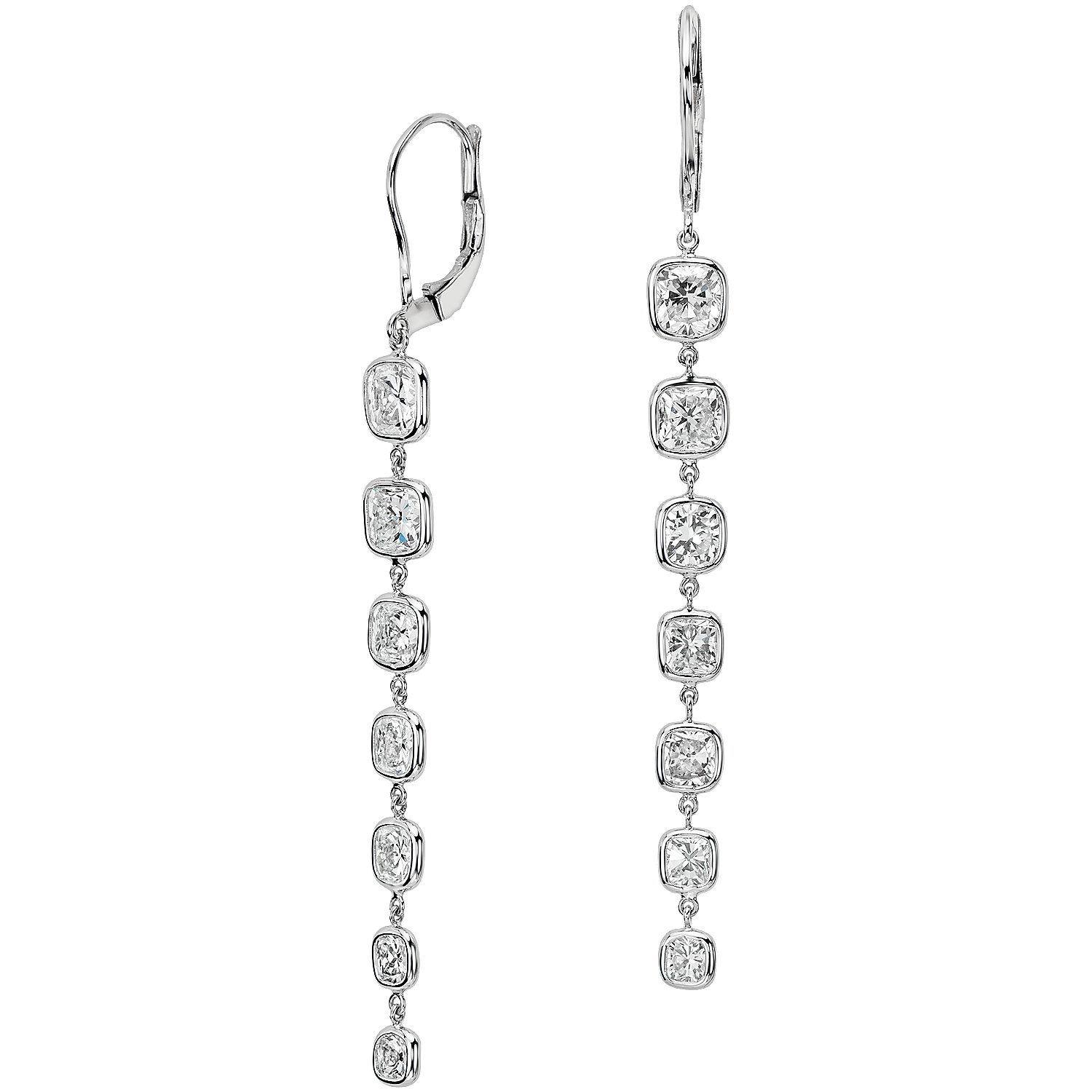 Dramatic and sophisticated, these stunning diamond drop earrings showcase cascading brilliance with fourteen, ideally matched, cushion-cut diamonds bezel-set in classic 18k white gold.