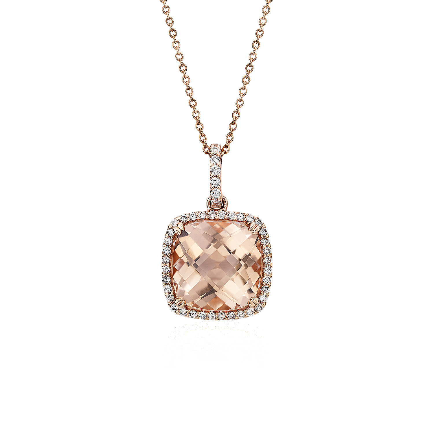 The lush cushion-cut morganite of this 14k rose gold pendant necklace commands attention. A halo of brilliant round diamonds provides a luminous finish. Adjustable cable chain length delivers a just-right fit.