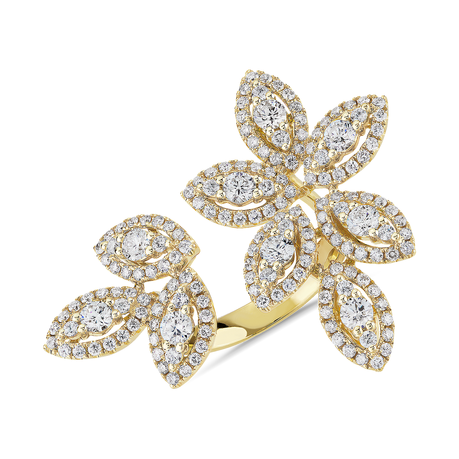 Make a decadent fashion statement with this nature-inspired piece created in brilliant diamonds and on-trend yellow gold. Unfortunately, we can’t resize this style, so please measure your ring size carefully. Also, we recommend this ring for special occasions only because we are unable to make repairs.
