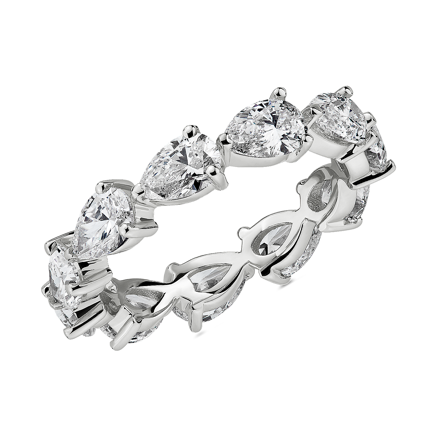 Sumptuous pear-shape diamonds placed into an unexpected east-west setting play up the modern extravagance of their curving lines and defined angles. Light reflects off of 14k white gold and onto the stones for sparkle that radiates all over.