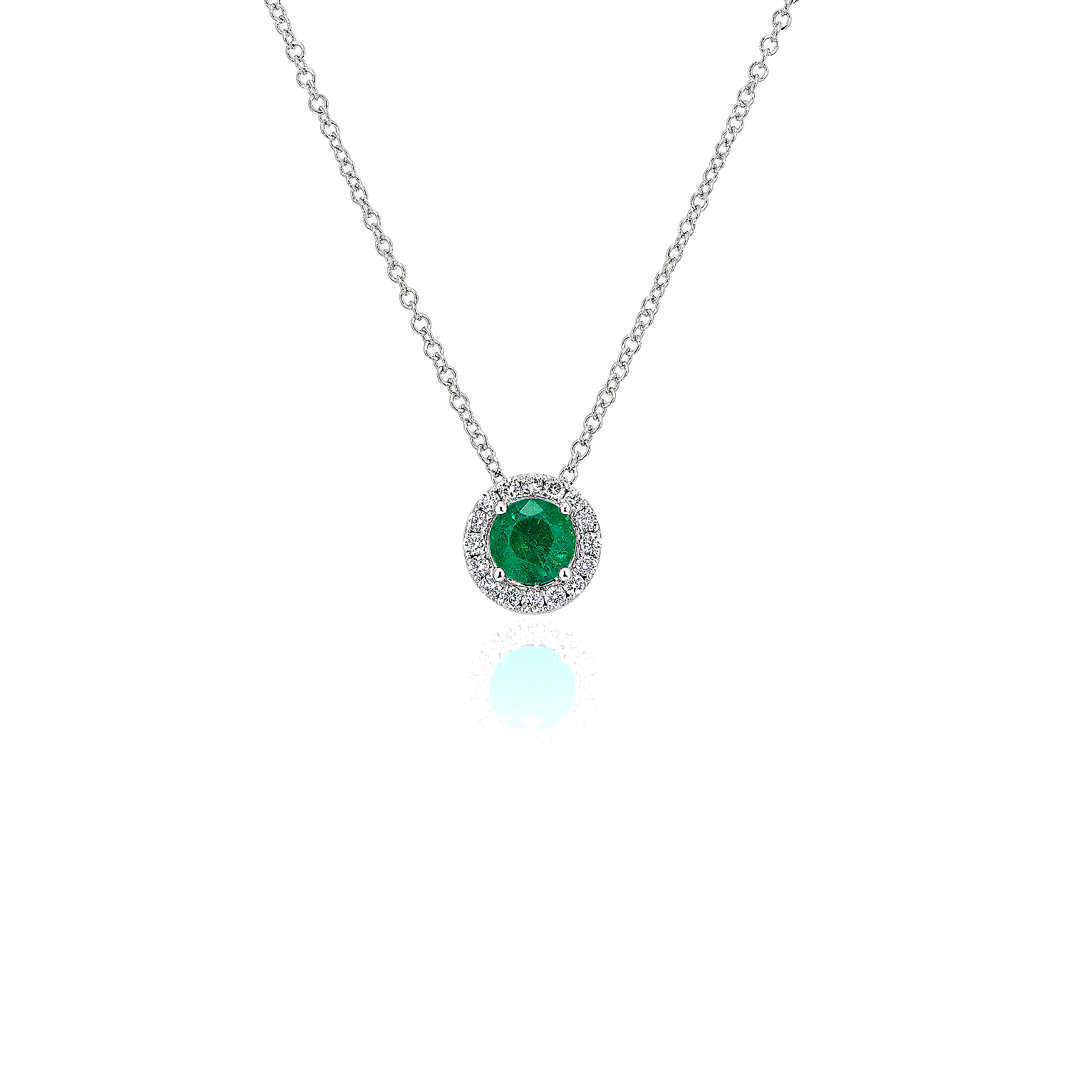 Capture your ray of starlight when layering on this striking 14k white gold pendant necklace. Its perfectly round emerald baths in the light of a white diamond halo creating a beautiful interplay of sparkle and color.