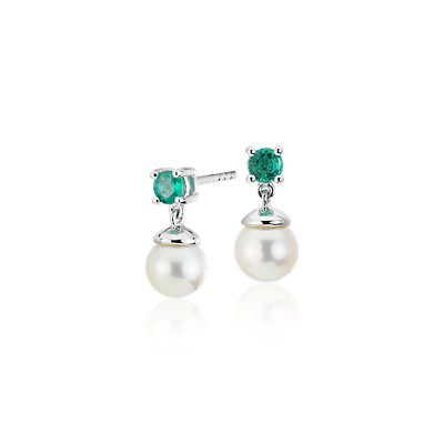 Vivid and luminous, these emerald and freshwater cultured pearl drop earrings are set in 18k white gold and make a fashionable and very wearable gift.
