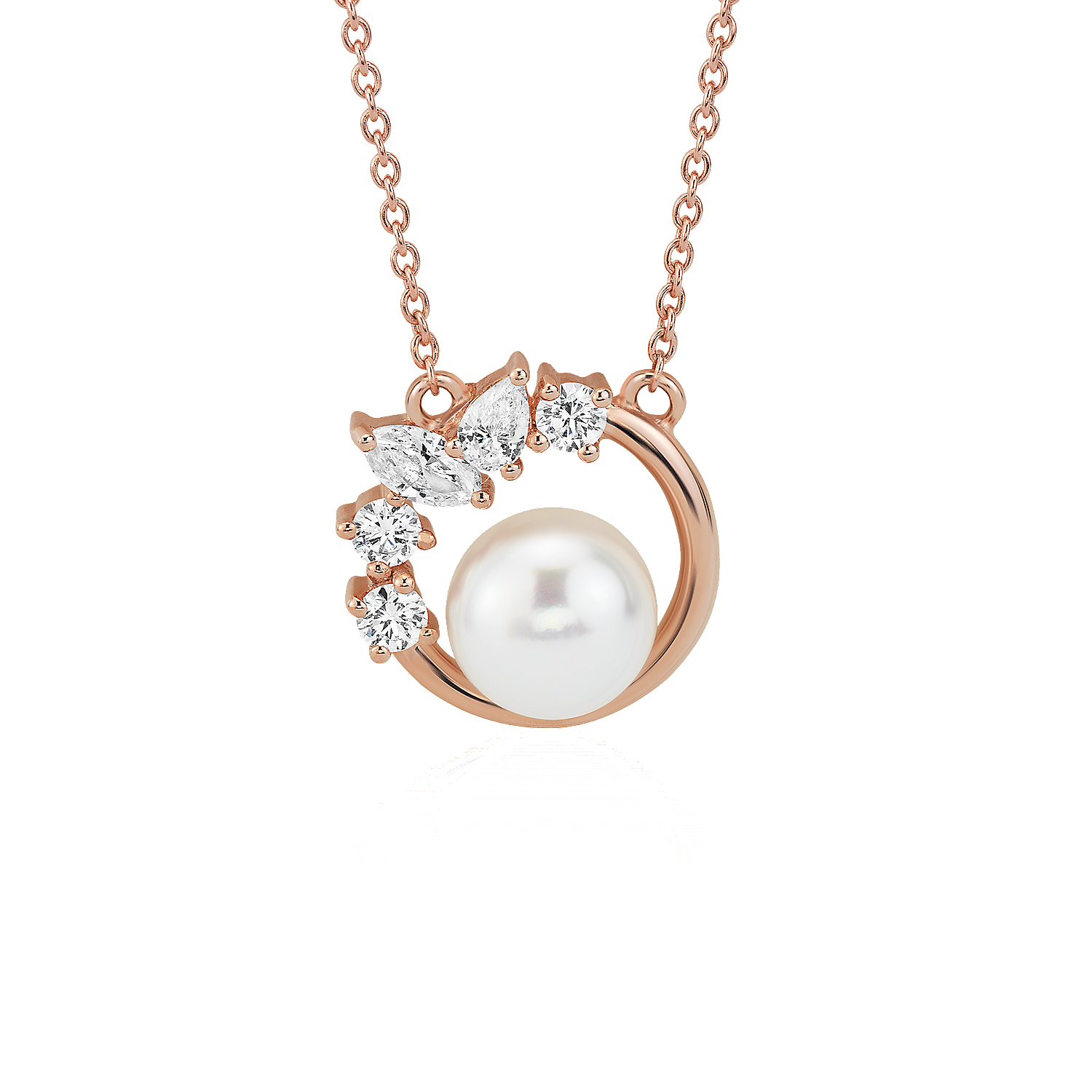 This beautiful pendant showcases a single freshwater pearl encircled by a band of rose gold adorned with marquise, round and pear-shaped diamonds. It hangs from a 14k rose gold cable that can be worn at 16 or 18 inches, and is secured by a lobster claw clasp.