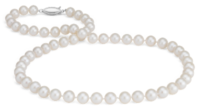 Our classic pearl strand features nearly round freshwater cultured pearls strung on a hand-knotted silk blend cord. At your choice of either 16, 18, 20, 24 or 36 inches, this strand is secured with a 14k white gold safety clasp. Blue Nile gemologists ensure that our pearls meet the highest quality expectations, ensuring you the best value.