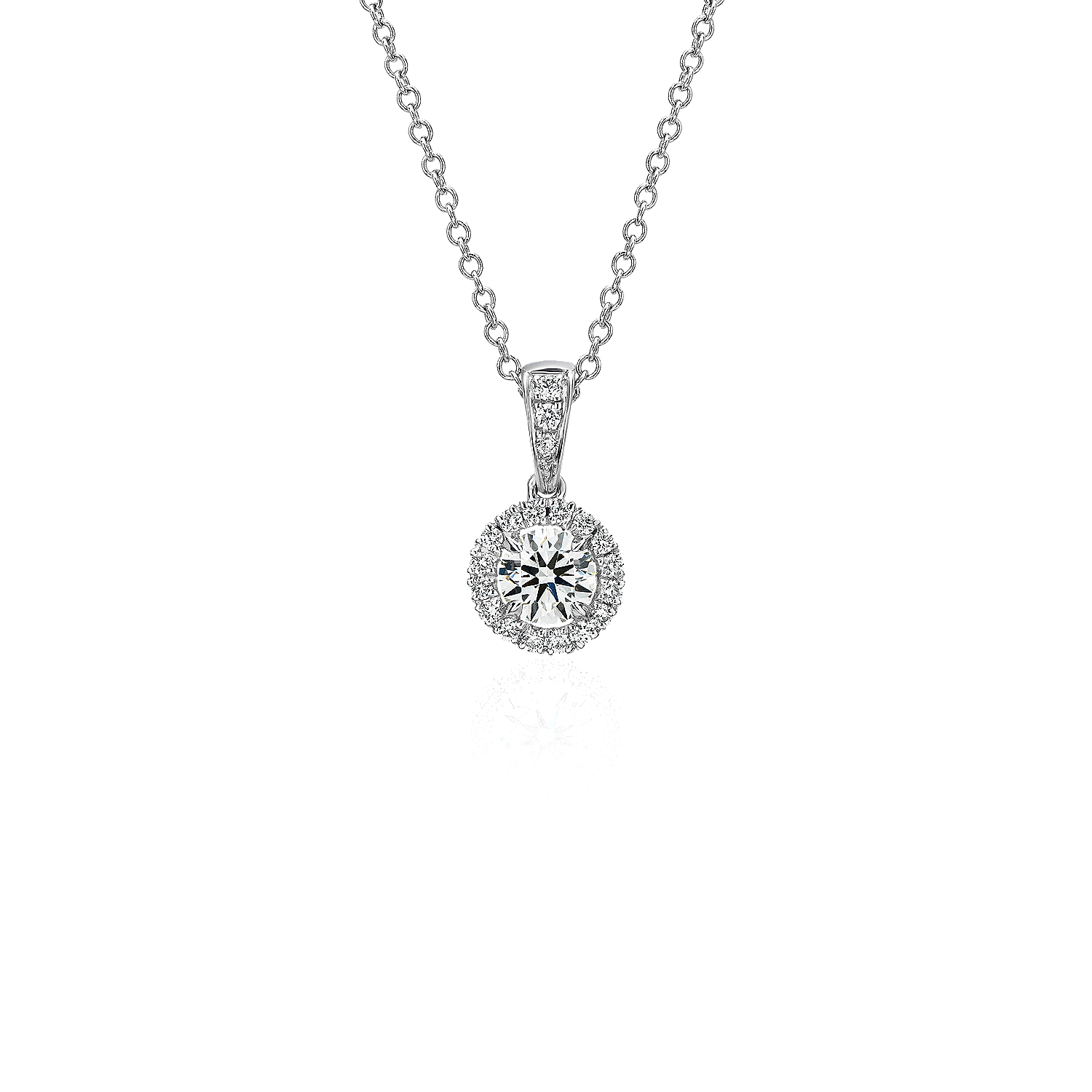Beautifully crafted, this diamond pendant has a single round brilliant-cut diamond surrounded by sparkling micropavé diamonds, a petite necklace that complements any ensemble.