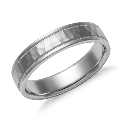 Hammered Milgrain Comfort Fit Wedding Ring in 14k White Gold (5mm)