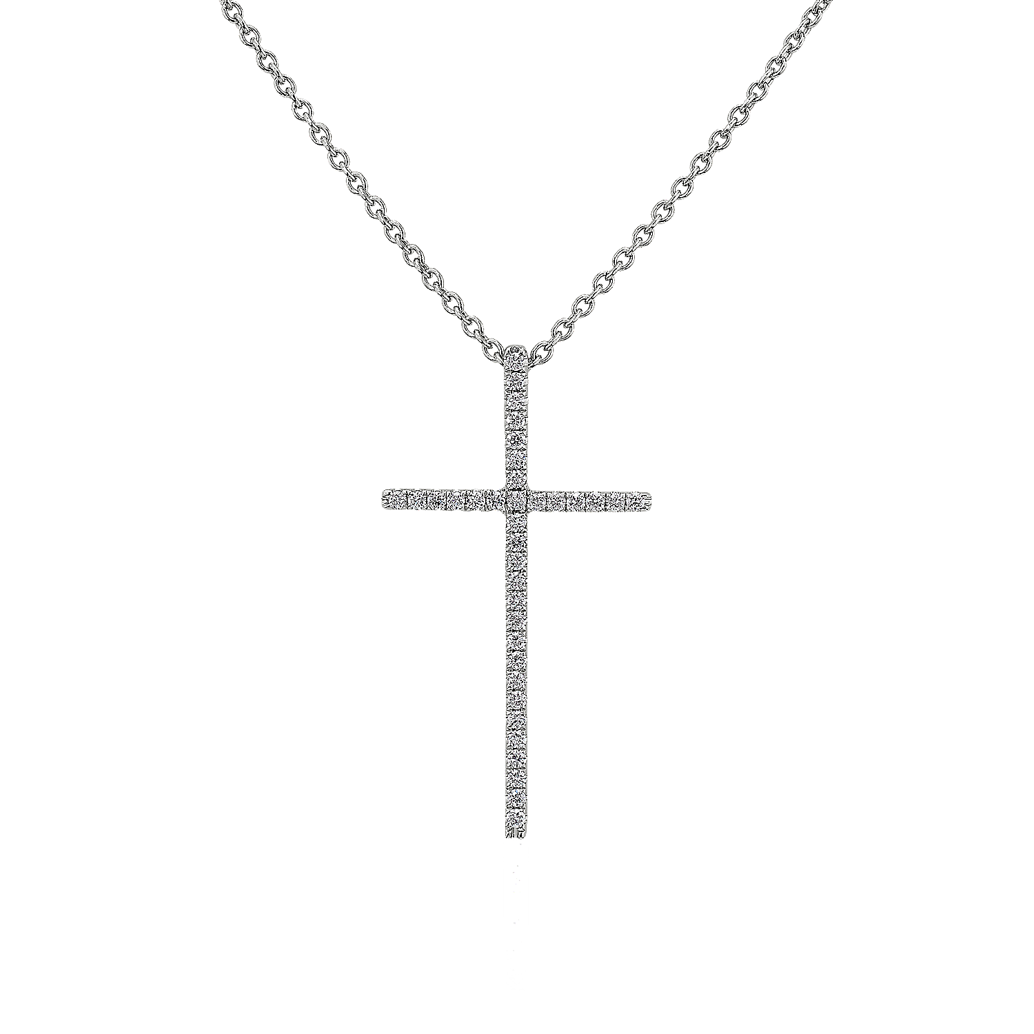 Sparkling elegance defines the slender design of this 14k white gold cross pendant necklace traced with demure round diamonds that reflect light all across its surface.