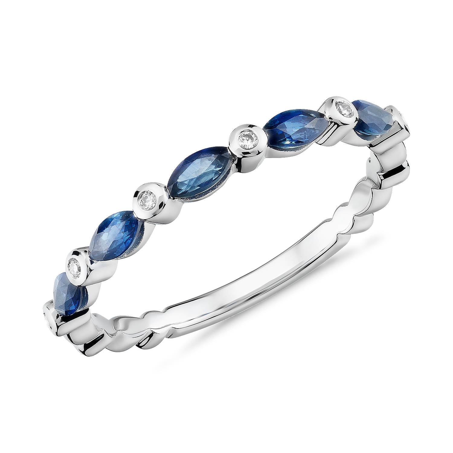 Sleek, richly hued marquise-shaped sapphires alternate with brilliant bezel-set round diamonds on this delicate anniversary ring, accentuated by the crisp shimmer of 14k white gold.
