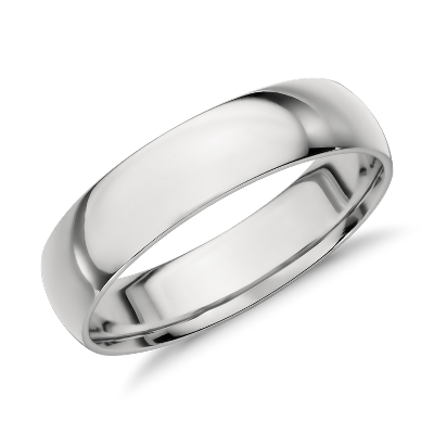 This mid-weight, high polish, platinum wedding ring has a traditional higher domed exterior profile and a curved inner edge, which makes it extra comfortable for everyday wear.