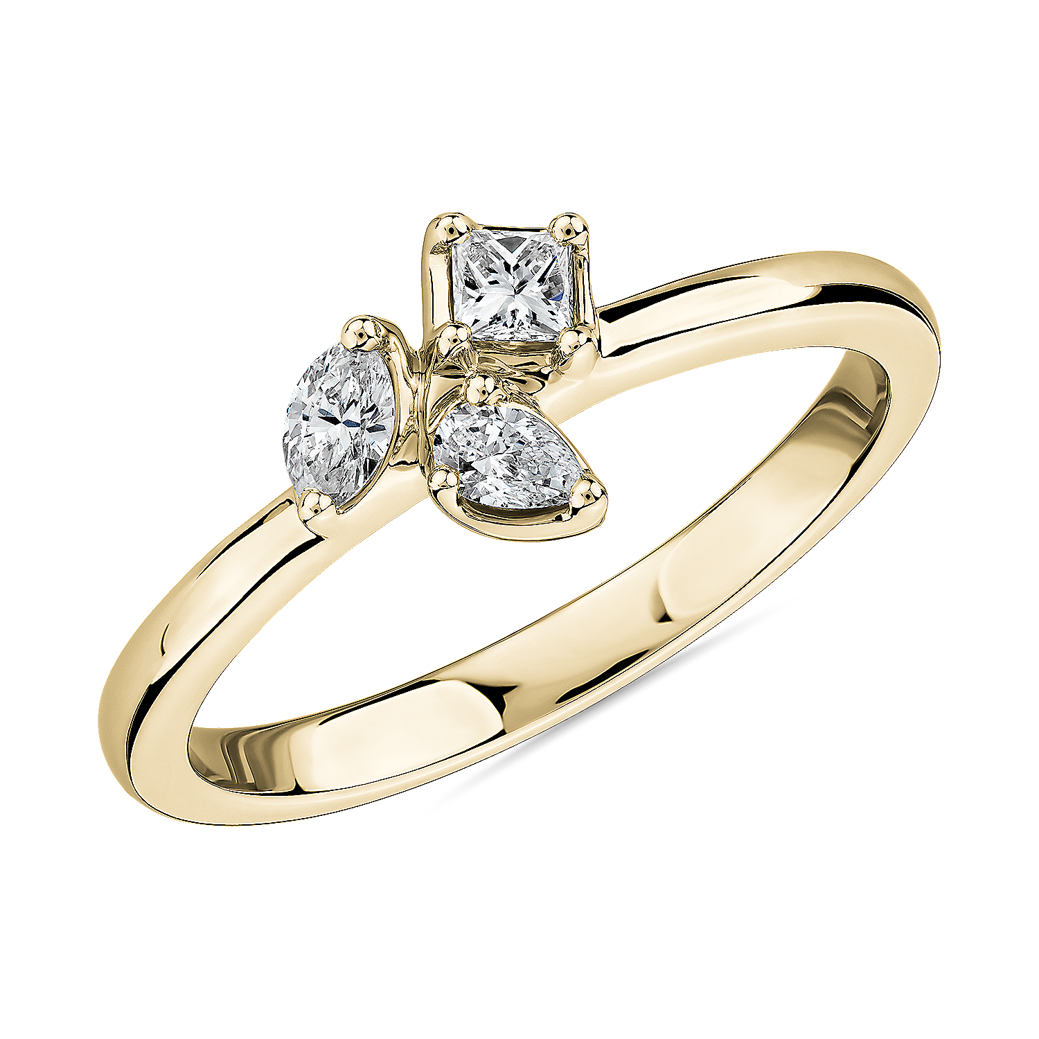This on-trend yellow gold ring mixes three fancy-shaped diamonds in a modern arrangement. Wear it alone for a bit of everyday sparkle, or add a contemporary edge to your stack. Due to this ring’s delicate nature, we do not recommend for daily wear and are unable to resize or repair.