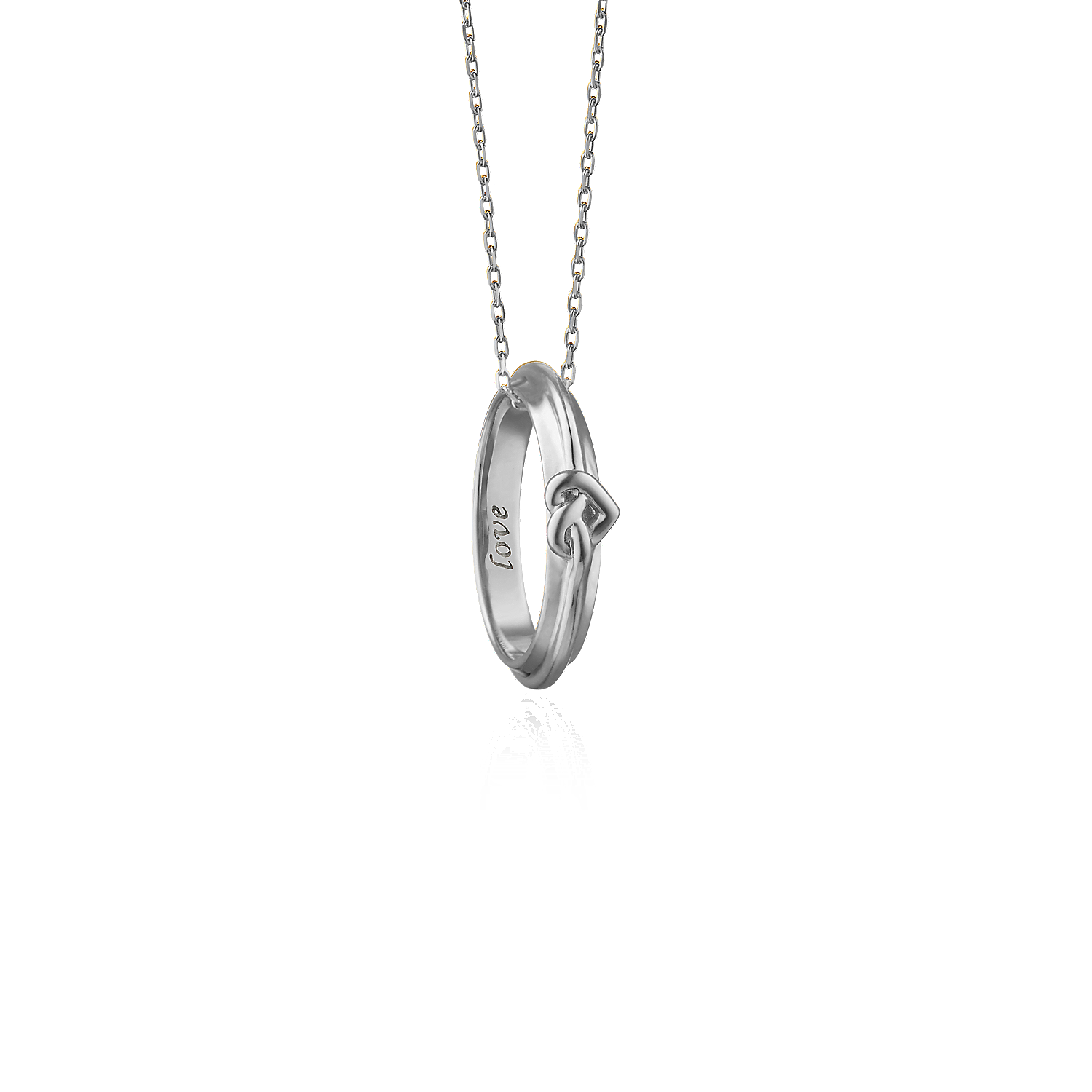 Made from sterling silver this poesy ring necklace features a classic love knot motif and is a timeless expression of romance with “Love” inscribed on the inside of the ring.