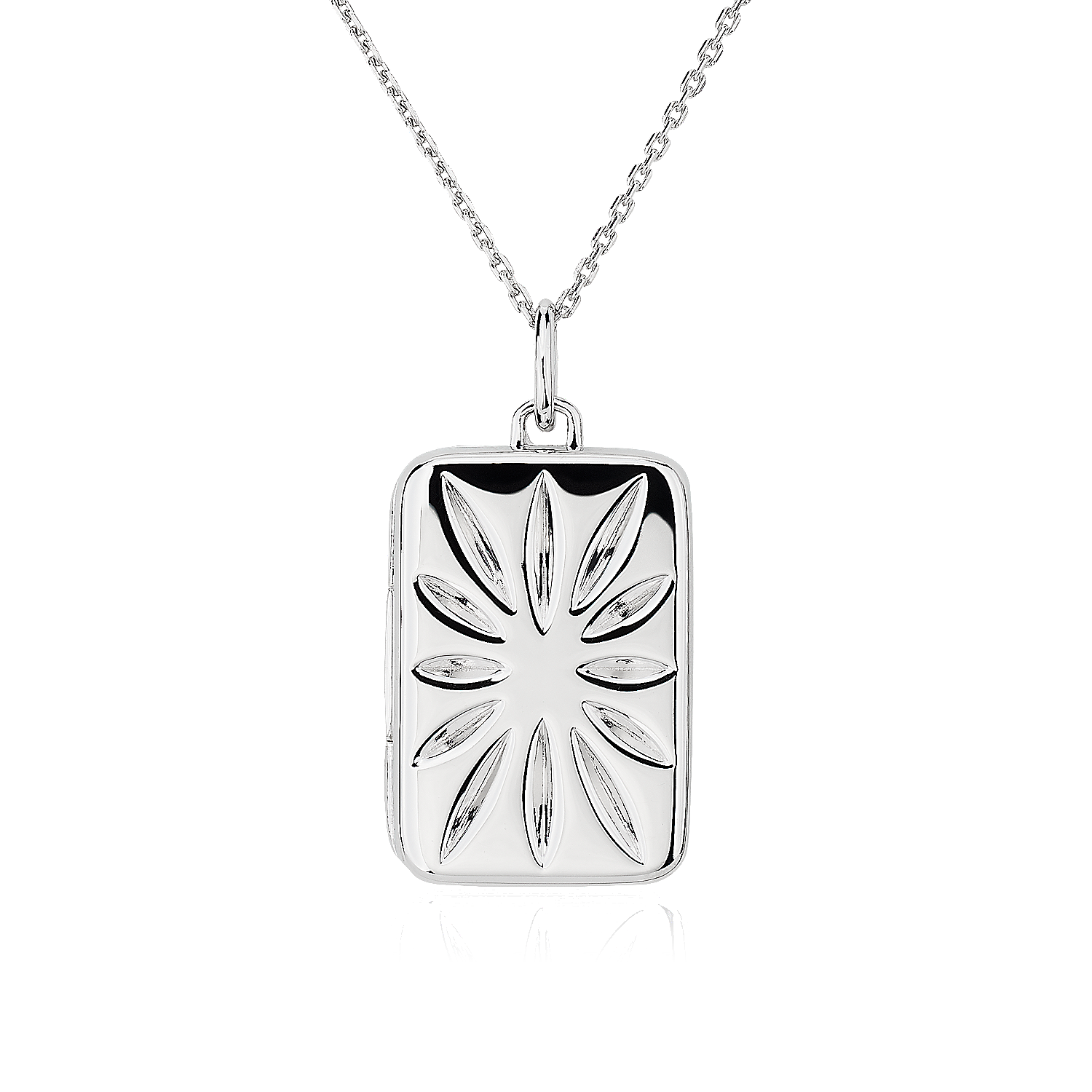 Keep your most precious memories close to your heart with this sterling silver rectangle locket etched with an abstract sunburst on its face as it hangs elegantly from its lighter than air chain.
