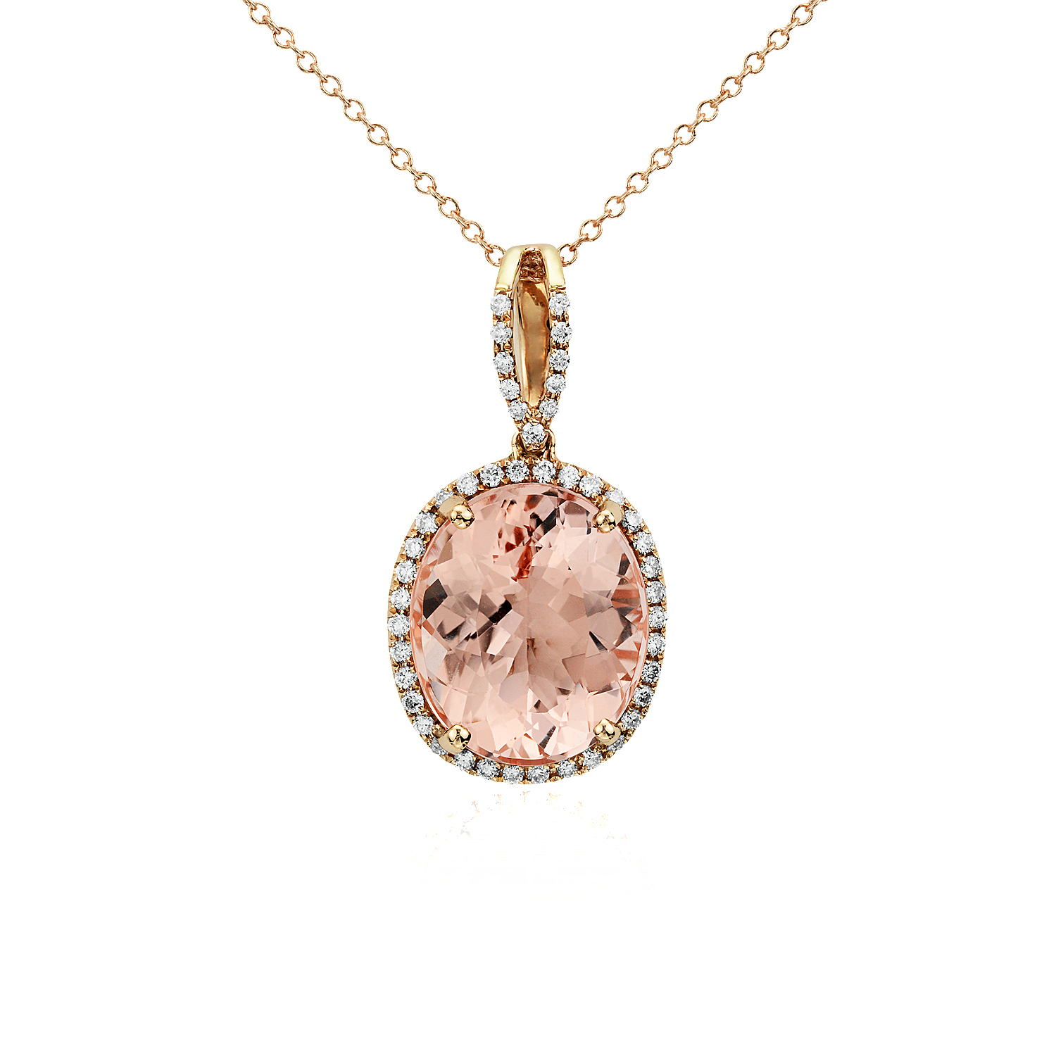 This peachy-pink, oval morgaite gemstone is accented by a delicate halo of micro-pavé set diamonds. A feminine statement piece, completed with a 14-karat rose gold cable chain.