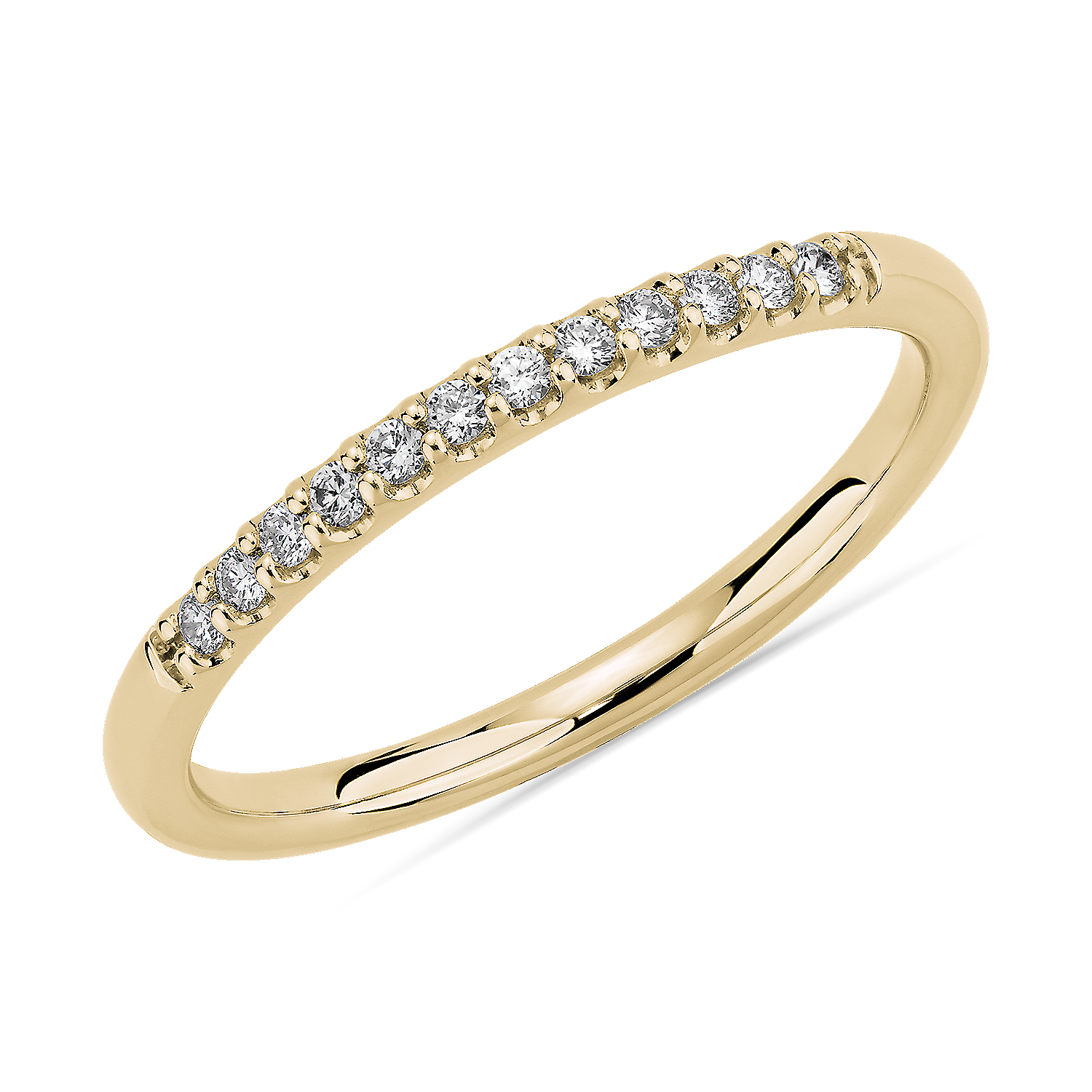 Nestle this elegant 14k yellow gold wedding ring next to its perfect engagement ring match, stock number 76216, for a brilliant display of everlasting love. It shimmers beautifully in the light, featuring 1/10 ct. tw. of diamonds set in a delicate petite prong setting.