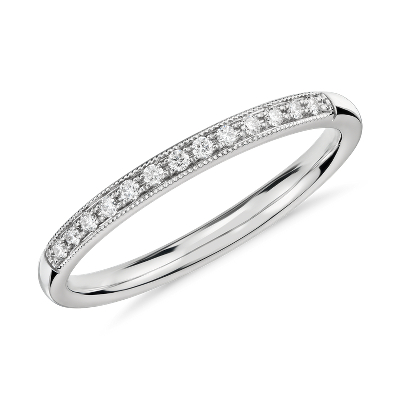 Delicately crafted, this pavé diamond ring in 14k white gold features diamonds along the top of the ring to create a fine line of brilliance and a milgrain edge for a vintage touch.
