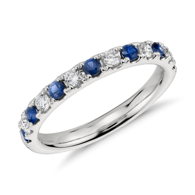 Classic and stunning, this sapphire and diamond band features alternating stones set in enduring platinum, perfect for a wedding or anniversary band.