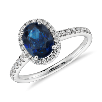 A shimmering blue oval sapphire gemstone rests elegantly in a halo of stunning micropavé diamonds set in 14k white gold.