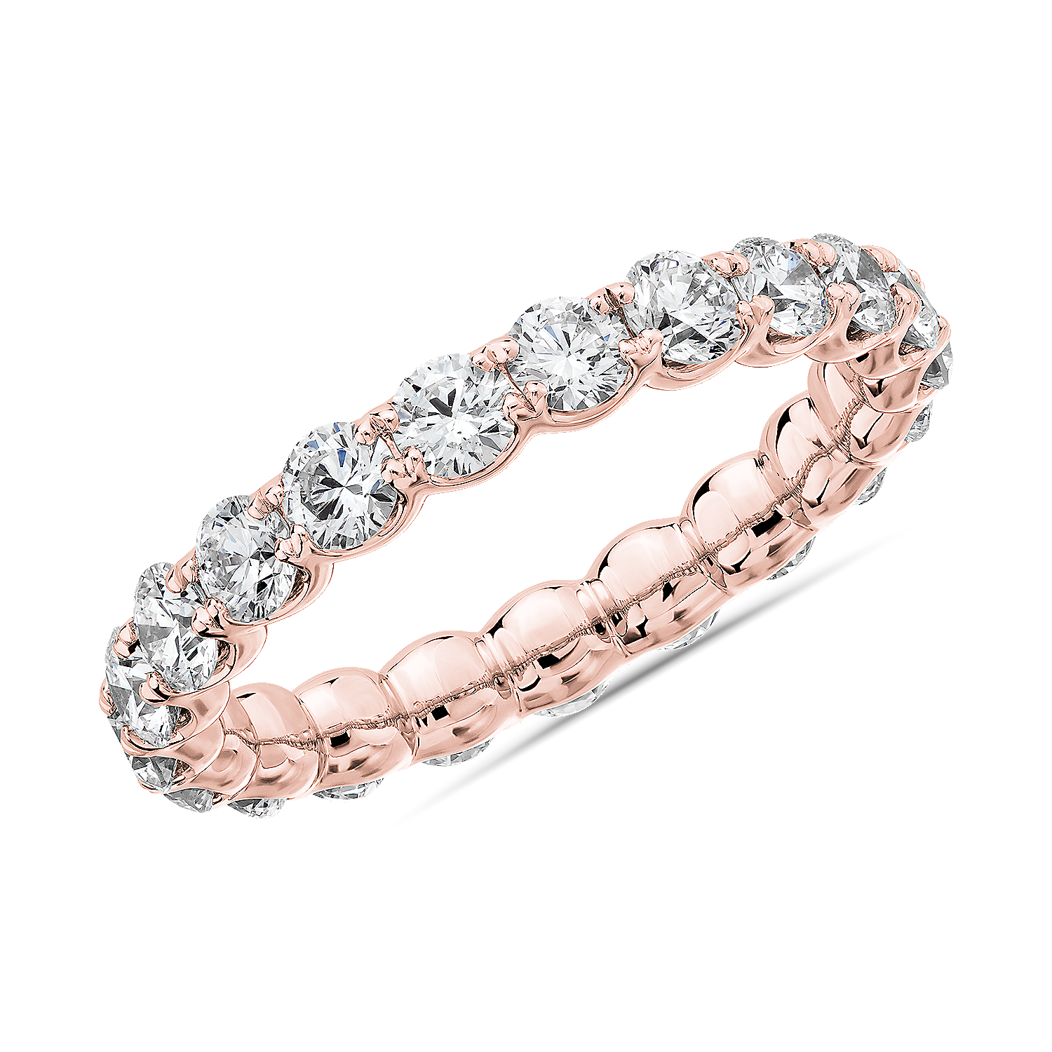 Upgrade your ring stack with glamorous sparkle that radiates from every angle with round diamonds running around this 14k rose gold eternity ring.