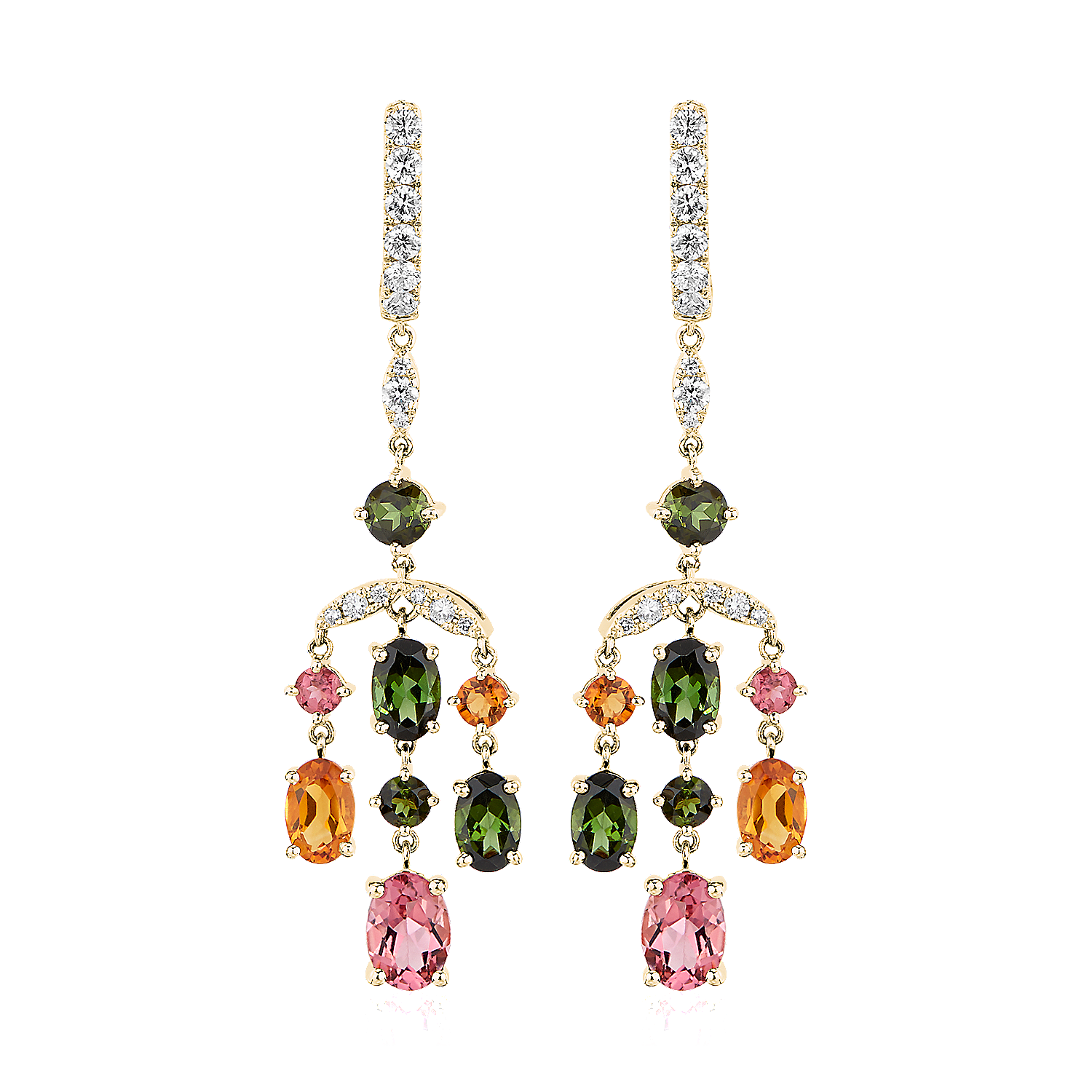 Colorful and unique, these gemstone and diamond earrings feature vibrant tourmaline and citrine stones beautifully set in 14k yellow gold.
