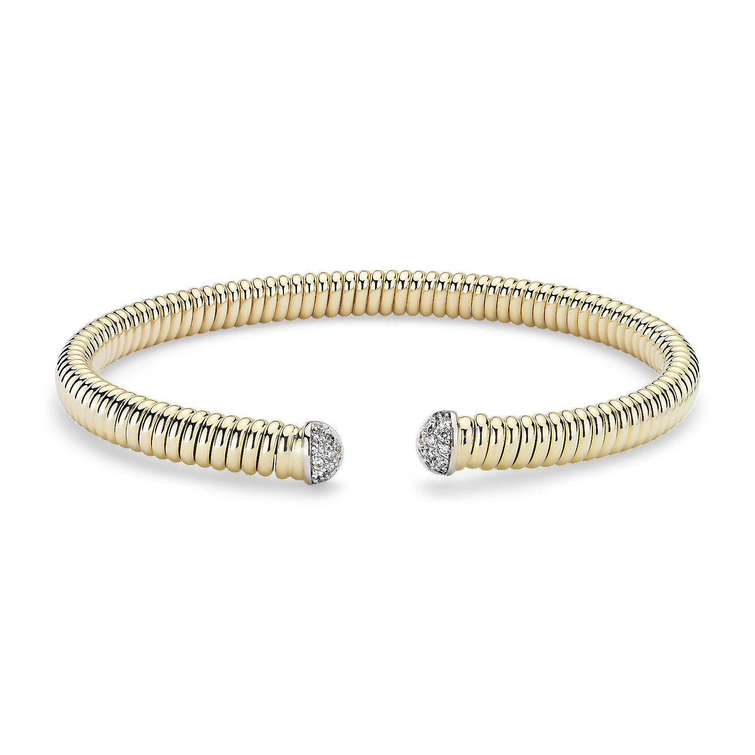 The rich tones of 18k yellow gold spiral across the length of this gleaming bracelet, ending in brilliant tips of 18k white gold paved with tiny, brilliant round-cut diamonds.