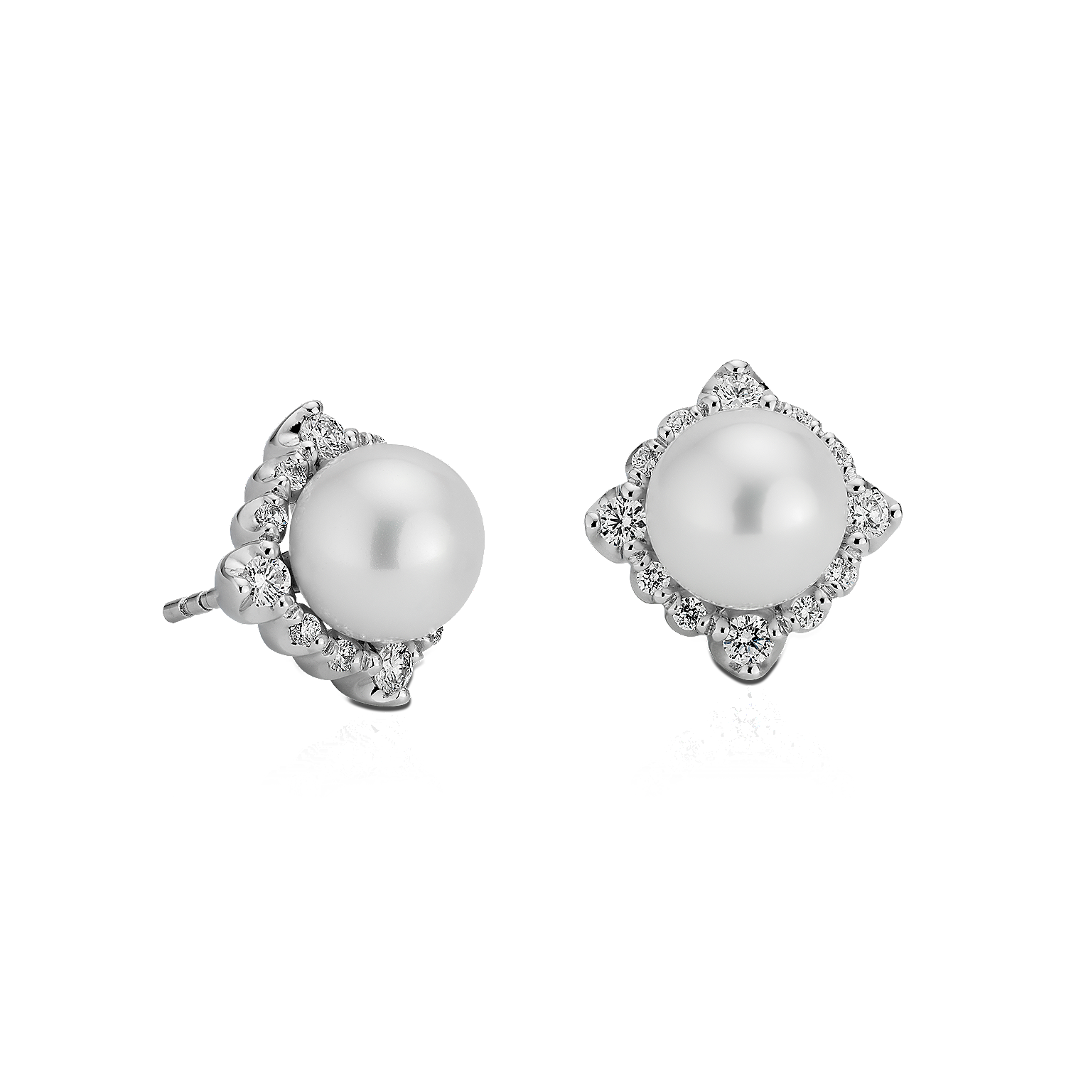 Vintage-Inspired Freshwater Cultured Pearl Diamond Halo Earrings in 14k White Gold (7-7.5mm)